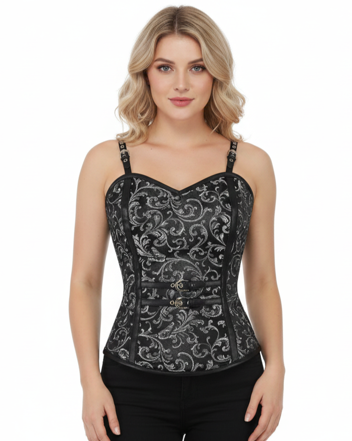 2 black leather belts cross over the shoulders and designed at front on this black and silver brocade overbust corset to provide a unique look. Also has a side zipper opening and back lace.