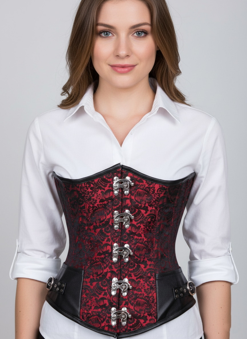 Red Black Brocade Leather Gothic LONGLINE Underbust Corset Waist Training