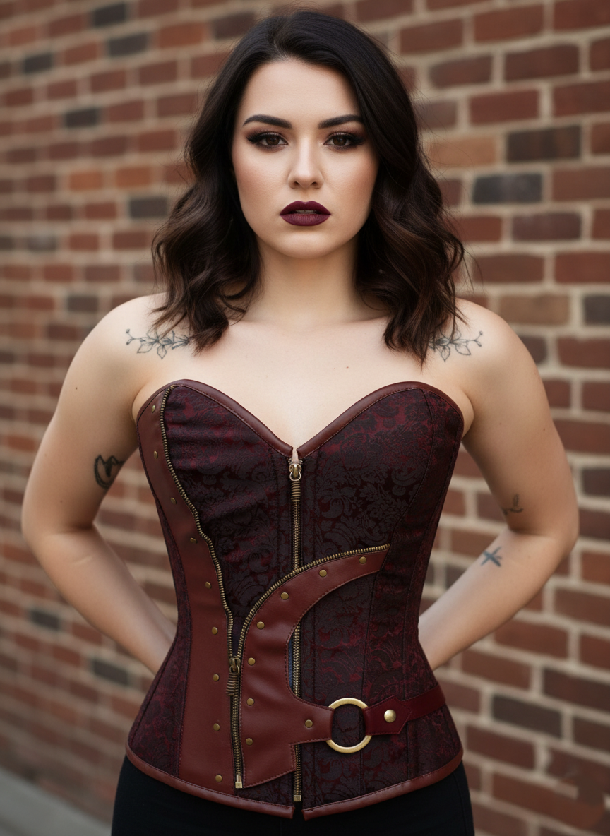There's an air of comfort along with sexy steampunk period look in this brown overbust corset. It comes with a front zipper and leather work across the corset and is complemented by zipper on leather and a buckle attached with a patch.