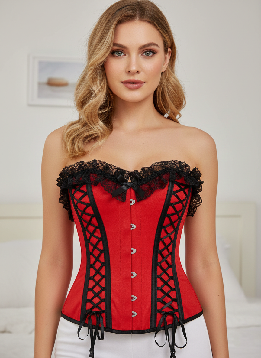 Beautiful red satin overbust corset with black lace work over two sides and frills over the bust line will make you look gorgeous.
