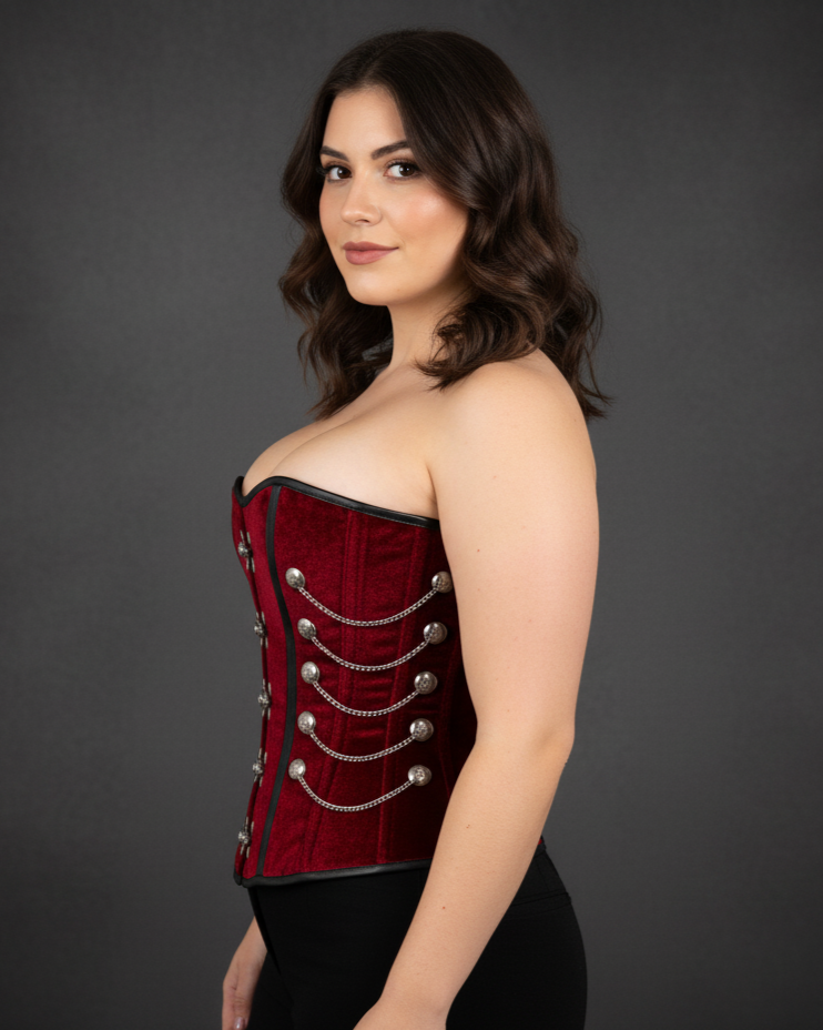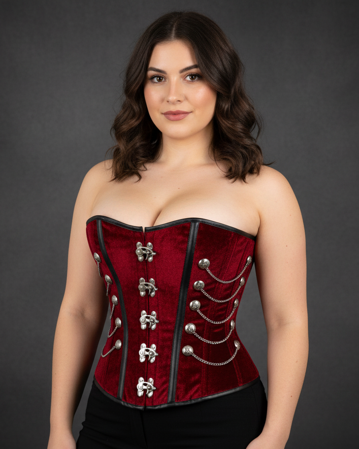 A soft fabric like velvet is graced with metal chains and seal locks, gives the corset a complete steampunk looks. Deep red color velvet with black leather strips, only adds to the gothic costume.