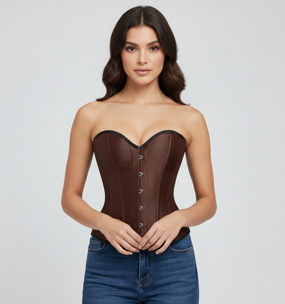 Beautiful brown satin long overbust corset has its own gorgeous appeal. The brown, satiny material feels as good as it looks. This corset top looks stunning and comfortable to wear.