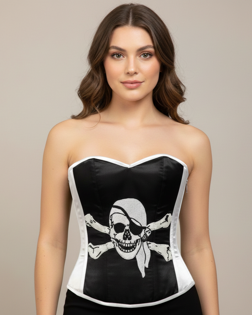 A basic black and white corset with danger skull design on it,
