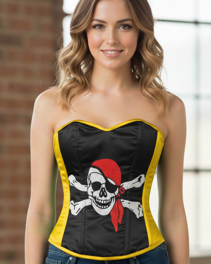 Black and Yellow Satin Pirate Sequins Hand Work Costume Bustier Steampunk Waist Cincher Overbust Top