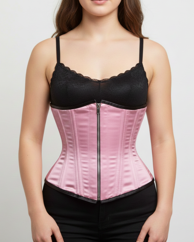 Plus Size Baby Pink Satin Double Bone Front Silver Zipper Gothic Underbust Bustier Corset