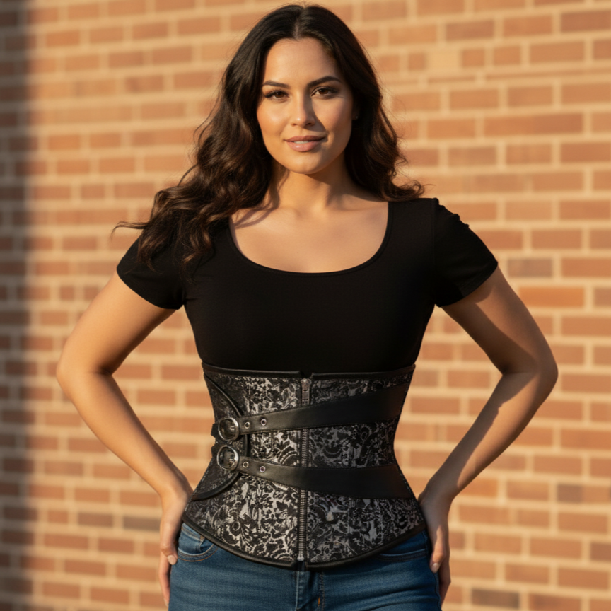 2 asymmetric black belts cross over this black and silver underbust corset to provide a unique look.