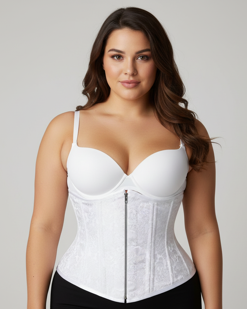 Plus Size White Brocade Double Bone Front Silver Zipper Gothic Underbust Bustier Corset